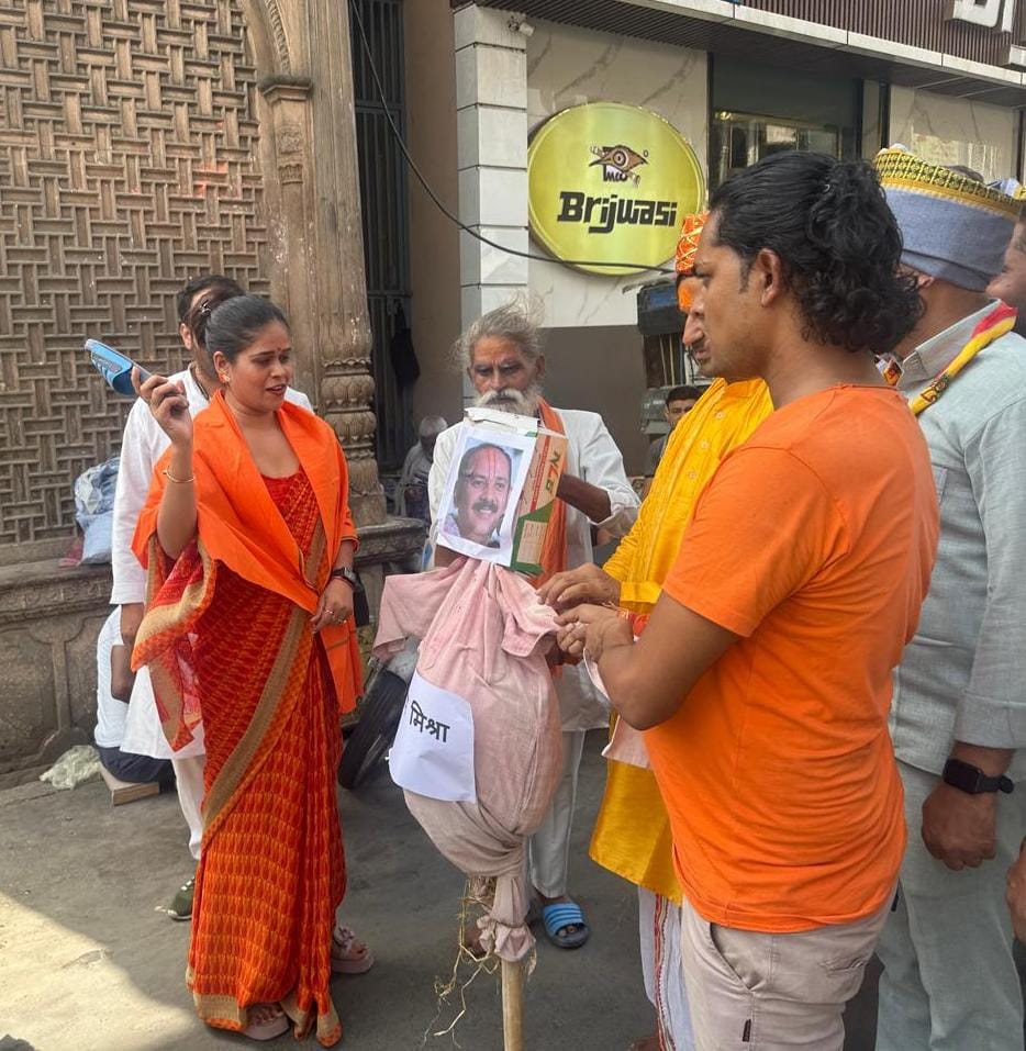 अखिल भारत हिंदू महासभा एवं श्री कृष्ण जन्मभूमि संघर्ष न्यास ने मथुरा के हृदय स्थल होली गेट पर कथावाचक प्रदीप मिश्रा का प्रतीकात्मक पुतला फूंक कर अपना आक्रोश जताया।