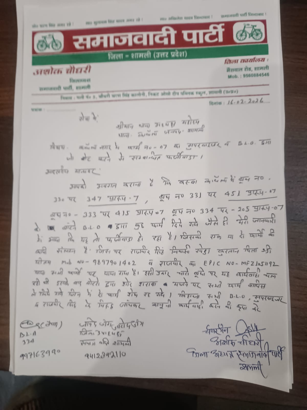 जिला-उपाध्यक्ष जावेद जंग ने बताया कि पार्टी के नियुक्त बीएलए तैयब ने सूचना दी कि कांधला के बूथ संख्या 330 पर 347 फार्म-7, बूथ संख्या 331 पर 451 फार्म-7 और बूथ संख्या 334 पर 205 फार्म-7 प्राप्त हुए थे। फार्म वितरित करने के बाद जब मतदाताओं ने अपनी आपत्ति दर्ज कराई, तो सुपरवाइजर ने बीएलओ को फार्म वापस लेने का निर्देश दिया।