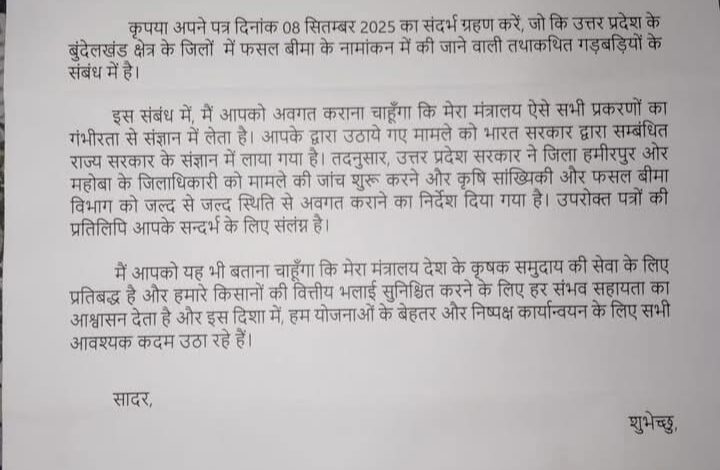 कृषि मंत्री भारत सरकार शिवराज सिंह चौहान ने हमीरपुर महोबा सपा सांसद अजेंद्र सिंह लोधी को पत्र भेज बुंदेलखंड में फसल बीमा में हुए फर्जीवाड़ा की उनकी मांग को राज्य सरकार के संज्ञान में लेने की जानकारी दे बताया कि शासन ने महोबा और हमीरपुर डीएम को मामले की जांच करा कृषि सांख्यिकी और फसल बीमा विभाग को जल्द से जल्द जांच रिपोर्ट तैयार करा स्थिति से अवगत कराने के निर्देश दिए हैं।