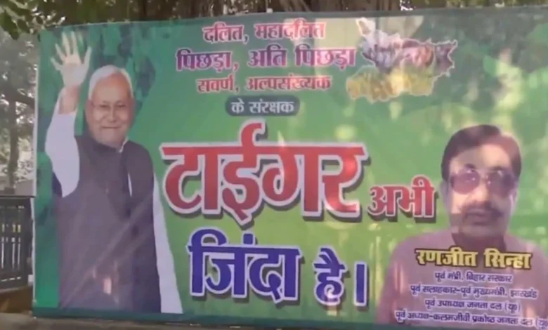 बिहार के पूर्व मंत्री रंजीत सिन्हा द्वारा पटना स्थित जनता दल (यूनाइटेड) कार्यालय के बाहर लगाए गए एक पोस्टर में मुख्यमंत्री नीतीश कुमार को ‘टाइगर ज़िंदा है’ की उपाधि दी गई है और उन्हें समाज के हाशिये पर पड़े लोगों सहित सभी समुदायों का “रक्षक” बताया गया है। यह पोस्टर पार्टी कार्यकर्ताओं की नीतीश कुमार को चौथी बार बिहार का मुख्यमंत्री बनते देखने की इच्छा को दर्शाता है। 2025 के बिहार विधानसभा चुनावों में विपक्षी महागठबंधन ने निश्चित रूप से मुख्यमंत्री पद के उम्मीदवार की घोषणा में देरी को लेकर कड़ी और लगातार आलोचना की है।