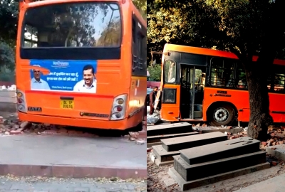 नई दिल्ली। दिल्ली के खान मार्केट इलाके में शनिवार को डीटीसी क्लस्टर की एक बस दीवार तोड़कर कब्रिस्तान में जा घुसी। घटना का वीडियो सोशल मीडिया पर वायरल हो रहा है।