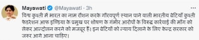 बसपा मुखिया मायावती सोमवार को ट्वीट के माध्यम से लिखा कि विश्व कुश्ती में भारत का नाम रौशन करके गौरवपूर्ण स्थान पाने वाली भारतीय बेटियां कुश्ती फेडरेशन आफ इण्डिया के प्रमुख पर शोषण के गंभीर आरोपों के विरुद्ध कार्रवाई की मांग को लेकर आन्दोलन करने को मजबूर हैं। इन बेटियों को न्याय दिलाने के लिए केन्द्र सरकार को जरूर आगे आना चाहिए।