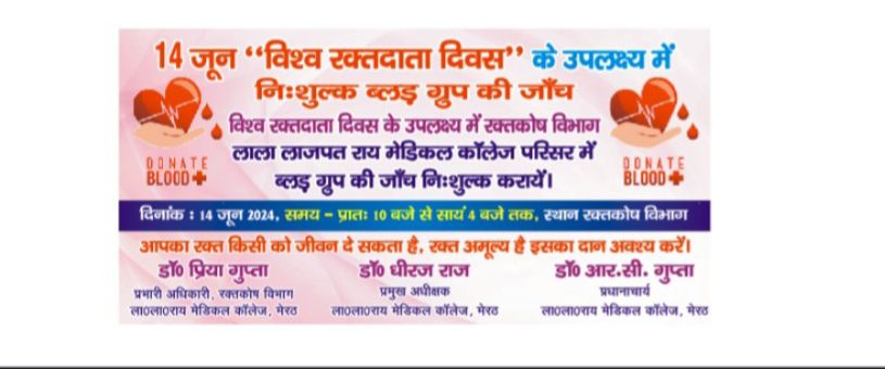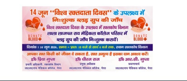 लाला लाजपत राय स्मारक मेडिकल कॉलेज मेरठ में रक्तदान शिविर एवं खून की जाँच निःशुल्क