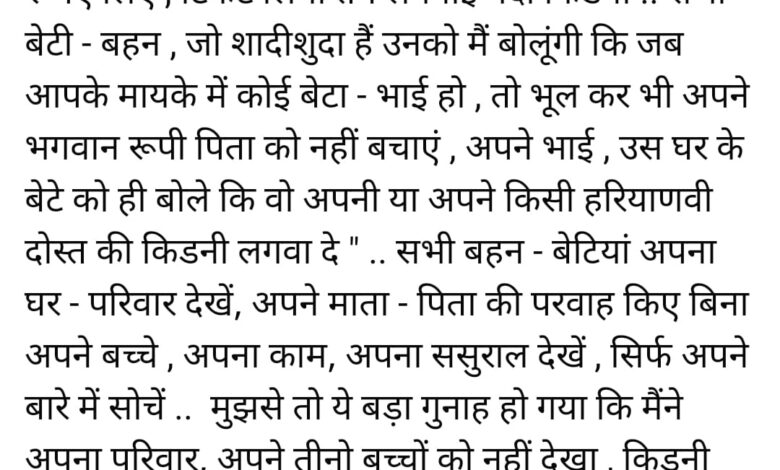 रोहिणी ने अपने सोशल मीडिया हैंडल पर लिखा, ” कल मुझे गालियों के साथ बोला गया कि मैं गंदी हूँ और मैंने अपने पिता को अपनी गंदी किडनी लगवा दी, करोड़ों रूपए लिए, टिकट लिया तब लगवाई गंदी किडनी। सभी बेटी – बहन, जो शादीशुदा हैं, उनको मैं बोलूंगी कि जब आपके मायके में कोई बेटा – भाई हो, तो भूल कर भी अपने भगवान रूपी पिता को नहीं बचाएं। अपने भाई, उस घर के बेटे को ही बोले कि वो अपनी या अपने किसी हरियाणवी दोस्त की किडनी लगवा दे। सभी बहन – बेटियां अपना घर – परिवार देखें, अपने माता – पिता की परवाह किए बिना अपने बच्चे, अपना काम, अपना ससुराल देखें। सिर्फ अपने बारे में सोचें। मुझसे तो ये बड़ा गुनाह हो गया कि मैंने अपना परिवार, अपने तीनो बच्चों को नहीं देखा, किडनी देते वक्त न अपने पति, न अपने ससुराल से अनुमति ली। अपने भगवान, अपने पिता को बचाने के लिए वो कर दिया, जिसे आज गंदा बता दिया गया। आप सब मेरे जैसी गलती, कभी ना करें, किसी के घर रोहिणी जैसी बेटी ना हो।”