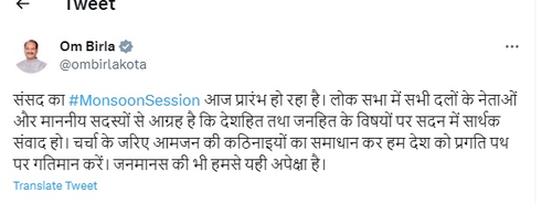 इससे पहले लोक सभा अध्यक्ष ओम बिरला ने ट्वीट कर कहा, “संसद का मानसून सत्र आज प्रारंभ हो रहा है। लोक सभा में सभी दलों के नेताओं और सदस्यों से आग्रह है कि देशहित तथा जनहित के विषयों पर सदन में सार्थक संवाद हो। चर्चा के जरिए आमजन की कठिनाइयों का समाधान कर हम देश को प्रगति पथ पर गतिमान करें। जनमानस की भी हमसे यही अपेक्षा है।”